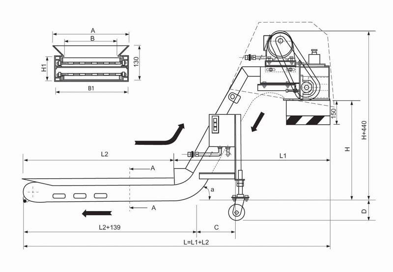 | 型號 | B | B1 | H | H1 | L | a | 較大排屑量(Kg/h) | 電機(jī)功率(W) |